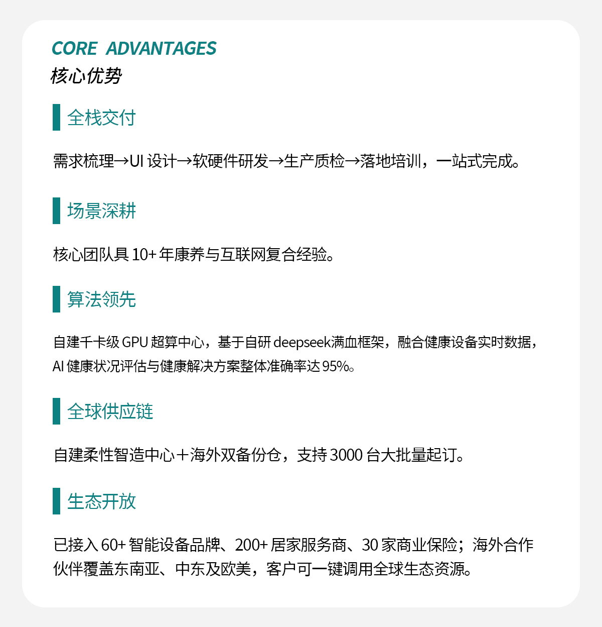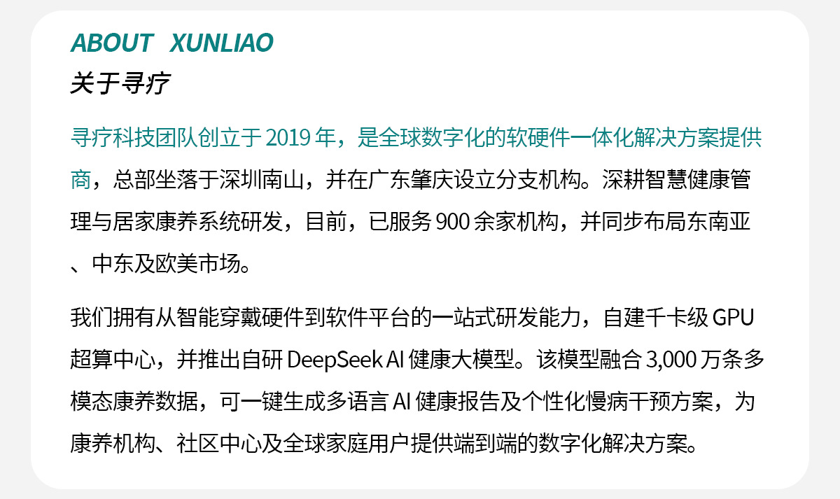 10000+企业部署商用 | 500+款硬件设备 | 50+产品软著 | 专注康养领域创新 | 科技型中小企业 | 专精特新中小企业 |