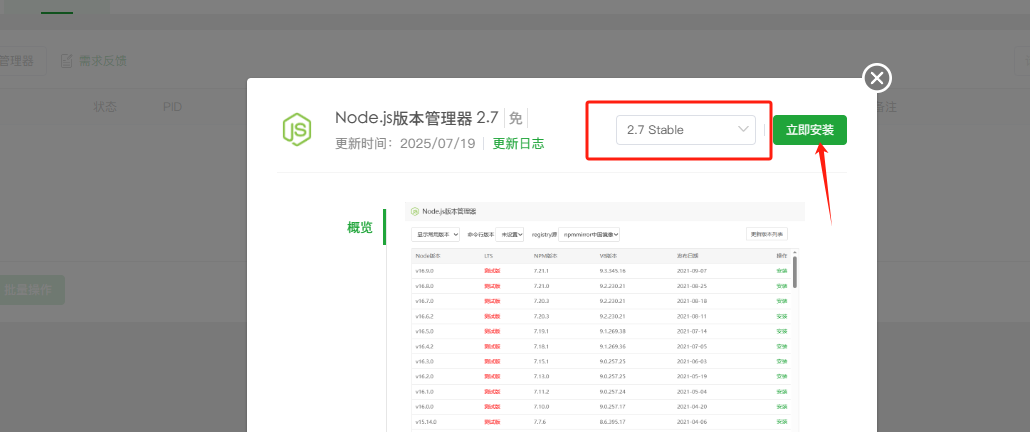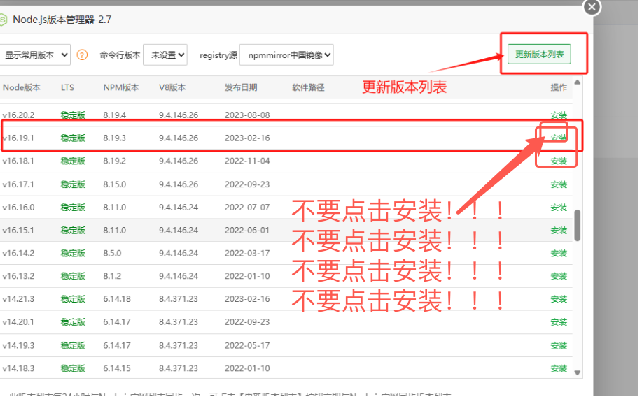 先点击“更新版本列表”查看v16.19.1 版本:【不要点安装】