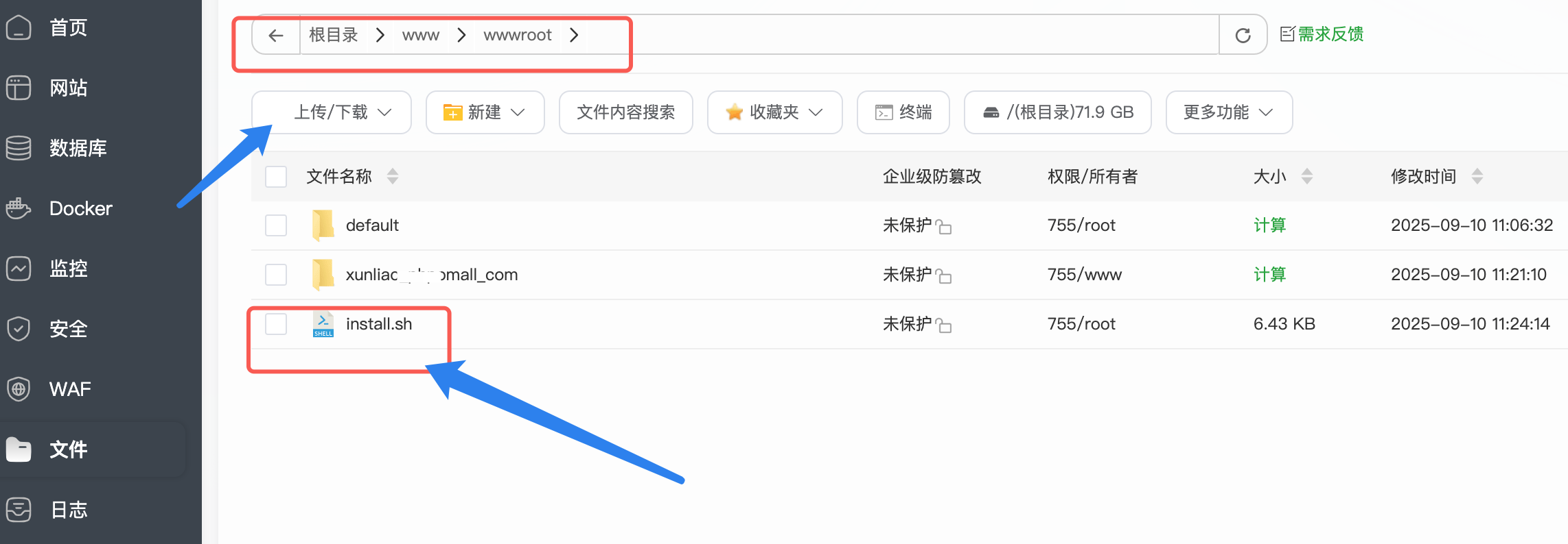 (2)将上面文件install.sh,下载下来放入目录,然后从终端执行这个文件,假设文件所在目录为:/www/wwwroot/install.sh,则在终端输入: