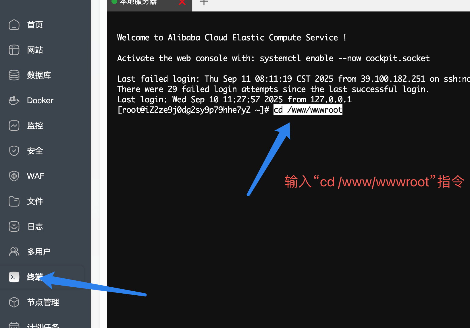 输入指令:cd /www/wwwroot,然后再输入指令:bash install.sh